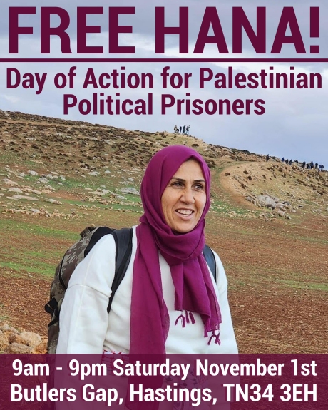 Saturday 1 November 9am - 9pm. Butler's Gap (the chess board on George Street). Palestine campaigners in Hastings are holding a 12 hour public exhibition about Palestinian political prisoners and a 24 hour solidarity hunger strike, to highlight the ongoing detention of Hana Albidaq in an Israeli prison in the West Bank.