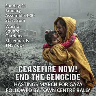 SUNDAY 21 JANUARY CEASEFIRE NOW! MARCH AND RALLY Join us this Sunday, January 21, at Warrior Square Gardens TN37 6DF, assemble 1.30pm, start at 2pm, for the Ceasefire Now march to Hastings Town Centre.