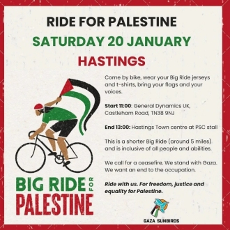 SATURDAY 20 JANUARY BIG RIDE FOR PALESTINE Start 11.00: General Dynamics UK, Castleham Road TN38 9NJ End 13.00: Hastings town centre at PSC stall.