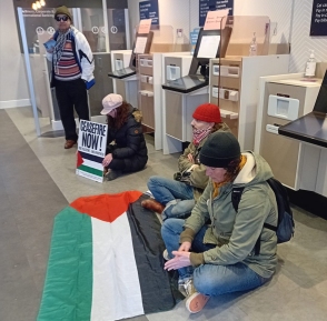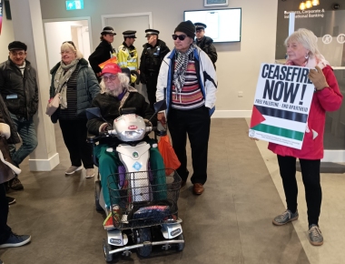 We made our voices known by occupying Barclays inside and outside with our stall which received non-stop interest and support from members of the public. We were able to give out information about Barclays' investments (through leaflets and through our PA system) in armaments companies such as BAE Systems, Boeing, General Dynamics, Ultra Electronics, QinetiQ, Raytheon and Israeli militarised drone manufacturer Elbit. All supply Israel's genocidal war machine. Thanks to everyone who came to support.