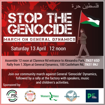 Saturday 13 April 12 noon. The march will start at 12 noon by the Clarence Road entrance to Alexandra Park and end at the General Dynamics site on Castleham Road, where we will hold a rally featuring speakers, music and children's activities. Bring signs, friends, family and BIG VOICES!