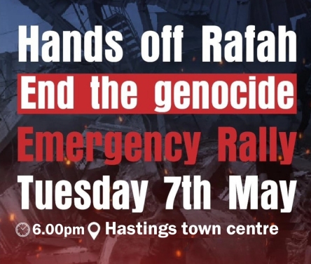 Israel has started heavy bombardment of what was the last supposed 'safe' area in Gaza. Join us for an emergency rally in the town centre to show your solidarity with the people of Palestine and demand an immediate end to UK support for Israel genocidal policies and an end to the two-way arms trade.