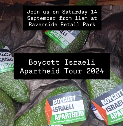 BOYCOTT ISRAELI APARTHEID TOUR Saturday 14 September. Ravenside Retail Park. 11am - 1pm.