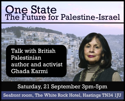 ONE STATE - THE ONLY DEMOCRATIC FUTURE FOR PALESTINE-ISRAEL WITH AUTHOR/ACTIVIST GHADA KARMI White Rock Hotel TN34 1JU. Saturday 21 September 3pm.