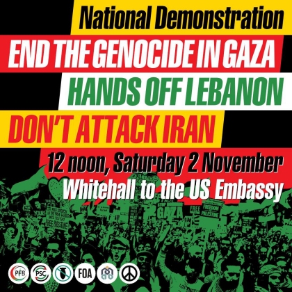 NATIONAL DEMONSTRATION: END THE GENOCIDE IN GAZA Saturday 2 November 12pm. Whitehall, London