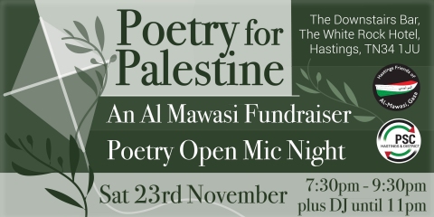 POETRY FOR PALESTINE OPEN MIC NIGHT - AN AL-MAWASI FUNDRAISER Saturday 23 November 7.30pm. The Downstairs Bar, White Rock Hotel TN34 1JU