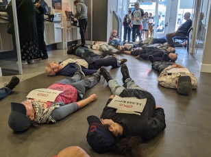 Below, left: Support for the #hastings3 at the local Magistrates Court; right: Die-in at Barclays, protesting at the bank's £2+ billion investments in armaments companies that supply the Israeli military.
