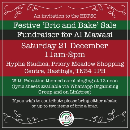 Come and find us in Priory Meadow - near to the Marks and Spencers entrance - for the final fundraiser of the year and alternative Palestine-themed carols. If you wish to contribute please bring either a bake or up to two items of bric a brac.