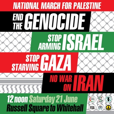 Saturday 21 June 12 noon. Russel Square. More information. As Israel commits genocide in Gaza and bombs Iran we must call on our governmentt to end its support for Israel's violence. Join us to demand our govt sanction Israel now.