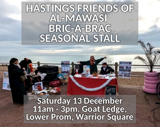Seasonal stall selling keffiyehs from Nablus, Palestine books, art works, original Christmas cards by local artist Marta Munoz, badges and bric-a-brac. We have already received some tremendous locally made crafts for our stall. Bric-a-brac donations welcome on the day. Come and browse and buy!. Tickets for our art raffle Strokes of Solidarity will also be on sale. All money will go to our friends in Al-Mawasi. More information (Facebook).