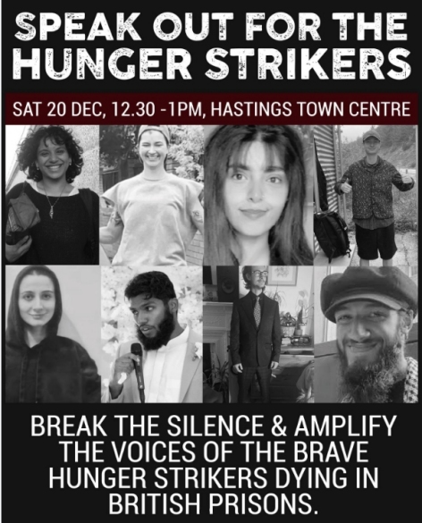 Join us on Saturday to show your support, amplify the voices of the strikers, and break the wall of silence. Support the anti-genocide hunger strikers who have been languishing in jail, in some cases more than a year. None have been found guilty of any crime. Yet they have all been denied bail and treated to repressive and inhumane conditions. We have invited the local MP and all local councillors to speak out and join us to read out letters and diary extracts from the strikers.