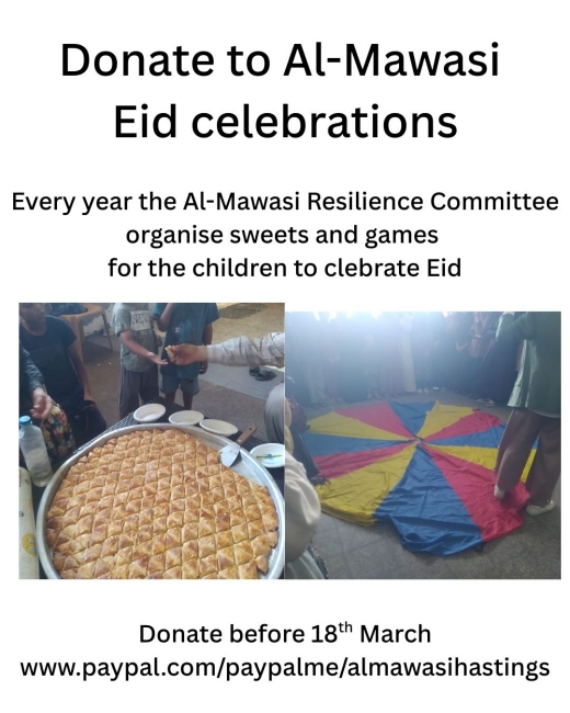 Donate by Paypal or you can also donate by online bank transfer if you send your donation marked 'Al-Mawasi' to the PSC bank account which is HPSC (Hastings Palestine Solidarity Campaign) 40-23-18 A/c 32319845