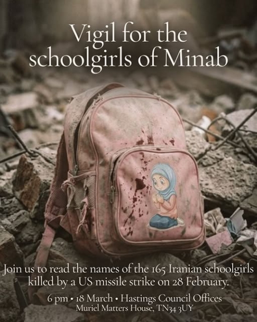Join us to read the names of the 165 Iranian schoolgirls from Minab killed by a US missile on the first day of this illegal and unprovoked war. These innocent children, aged between five and 12 years old, went to school on the morning of 28 February and never came home again.