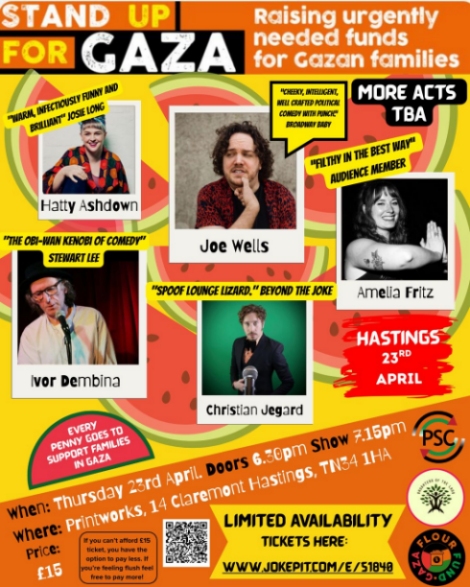 "Come along and have the craic while raising funds for our brothers and sisters in Gaza." Standard tickets £15. Option to pay less if you're skint. If you're feeling flush, you can pay more.